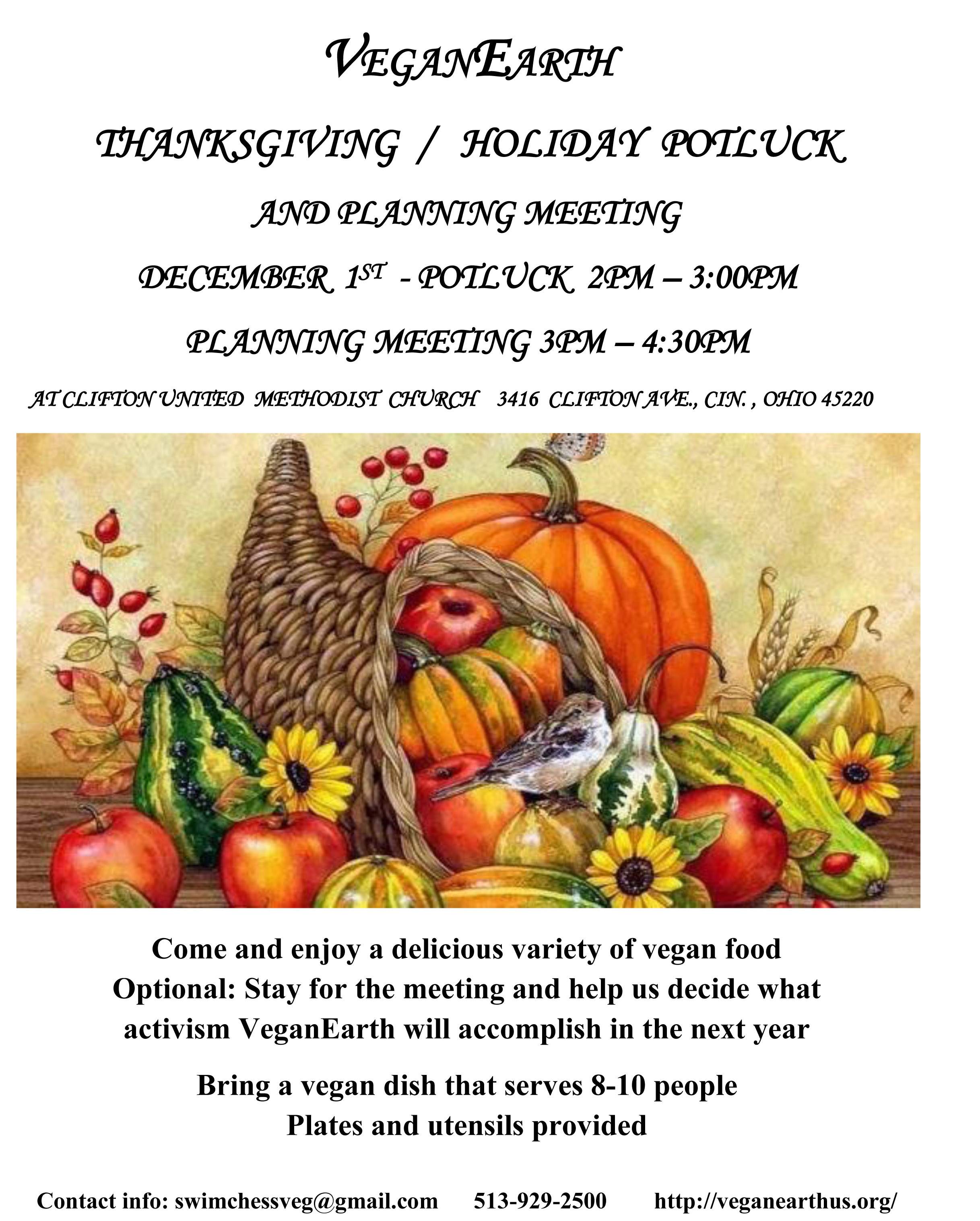 VeganEarth is a Cincinnati, OH based all volunteer nonprofit dedicated to teach and supports ways to eat and live that are healthful, sustainable, and compassionate toward animals, people and the earth.